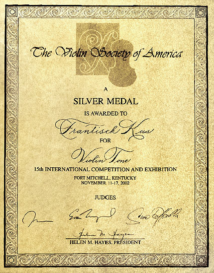 Stříbrná medaile za „zvuk houslí“, Mezinárodní houslařská soutěž ve Fort Mitchell, Kentucky (2002). Soutěže se účastnilo 181 nástrojů.